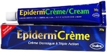 Huidbehandeling opnieuw uitgevonden. Dankzij de formule met drievoudige werking (antibacterieel, ontstekingsremmend en schimmelwerend) bestrijdt Epiderm Cream effectief en duurzaam huid- en hoofdhuidproblemen: acne, eczeem, psoriasis, puistjes, jeuk en huidontsteking. Je huid is gekalmeerd, je hoofdhuid is weer heilig. Unisex crème. Compositie: Betamethasondipropionaat USP 0,643 mg Gentamicinesulfaat BP komt overeen met gentamicinebasis 1 mg Tolnaftaat USP 10 mg Lodochloorhydroxychinoline 10 mg Chloorcresol BP (conserveermiddel) 1 mg Hulpstoffen: Ketomacrogol – 1000 BP, Ketostearinezuur BP, Zachte Witte Vaseline BP, Gezuiverd Water BP, Propyleenglycol BP en Dikhydraatdihydraat Dinatriumwaterstoffosfaat BP