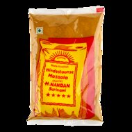 Beste kwaliteit Hindoestaanse kerrie masala. Lekker kerrie kruiden voor o.a. roti's. Masala (betekent kruidenmix) is een specerijenmengsel dat gebruikt wordt om Indiase en Surinaamse gerechten mee op smaak te brengen. Het bestaat onder andere uit kurkuma, koriander, komijn en peper. Overheerlijk en niet te missen bij uw masala gerechten. Hierbij wat recepten van Nandan zelf. Broodje Kip Kerrie 400 gr Kipfilet 1 Ui 2 Teentjes knoflook Zonnebloemolie Maggi blokjes Zwarte peper 1 EL tomatenpuree 2 EL H. Nandan Masala 4-6 Surinaamse puntjes Komkommer in Azijn Optioneel Madam Jeanette Bereidingswijze 1. Snijd de kipfilet in blokjes. Snipper de ui en hak de knoflook fijn. 2. Verhit een braad- of koekenpan en fruit de ui en knoflook in een scheut zonnebloemolie. Verkruimel de maggi blokjes erboven en voeg een snufje zwarte peper toe. Roer daarna 1 minuut de tomatenpuree mee. 3. Voeg de kip toe samen met 2 afgestreken eetlepels H. Nandan masala (of gewoon een volle eetlepel) en bak rondom bruin aan. Zet het vuur lager en schenk 100 ml heet water in de pan. Laat vervolgens 15 – 20 minuten pruttelen op laag vuur met de deksel schuin op de pan. Roer regelmatig door. 4. Snijd vlak voor serveren de broodjes doormidden en grill de binnenkanten even in een grillpan. Beleg ze naar eigen inzicht met de kip (inclusief een beetje saus), zuurgoed en sambal. Roti lams: Ingrediënten: 500 gr Lamsvlees 4 teentjes Knoflook 1 Ui 1 Madame jeanette peper 4 EL H. Nandan Masala Olie 600 gr Aardappel 1 Bouillon blokje 4 Gekookte en gepelde eieren Kousenband Rotivellen Bereidingswijze: 1. Snij het vlees in stukken en snipper de knoflook en ui. Doe deze vervolgens in een kom en meng dit samen met H. Nandan Masala. Laat in de tussentijd de olie warm worden in een wok pan op een laag vuurtje. 2. Doe het vlees in de pan en bak het vlees ongeveer 10 minuten tot het lichtbruin wordt. Voeg water toe en laat het bouillonblokje oplossen. Hierna voeg je een hele peper ( zorg ervoor dat de peper niet breekt) toe. 3. Voeg de gesneden aardappelen toe en laat alles koken in de pan. Laat het geheel ongeveer 20 minuten stomen op een laag vuurtje tot alles gaar is. 4. Hierna snij je de kousenband in kleine stukjes. Schenk een eetlepel olie in een wokpan en verwarm dit op een laag vuurtje. Voeg hierna een teentje gesnipperde knoflook toe en bak dit in de pan aan. Doe de kousenband nu in de pan op een laag vuurtje. En laat dit voor een minuut of 10 bakken naargelang je smaak. 5. Pak de rotivellen erbij. Je kunt de rotivellen zelf maken maar je kunt ze ook kant en klaar kopen. Leg de rotivellen op de borden. Doe het lamsvlees en kousenband ernaast, en om het af te maken een eitje erbij.